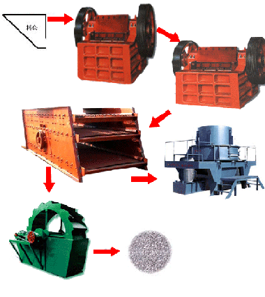 沙石生產(chǎn)線,砂石生產(chǎn)線,砂石生產(chǎn)線設(shè)備,砂石線,砂石生產(chǎn)設(shè)備基本流程:大塊石料經(jīng)料倉(cāng)由振動(dòng)給料機(jī)均勻地送進(jìn)鄂式破碎機(jī)進(jìn)行粗碎,粗碎后的石料由皮帶輸送機(jī)送到反擊式破碎機(jī)進(jìn)行進(jìn)一步破碎;不滿足粒度要求的石子由皮帶輸送機(jī)返料送到反擊式破碎機(jī)進(jìn)行再次破碎,形成閉路多次循環(huán)。細(xì)碎后的石料由皮帶輸送機(jī)送進(jìn)振動(dòng)篩進(jìn)行篩分,篩分出幾種不同規(guī)格的石子,滿足粒度要求的石子由成品皮帶輸送機(jī)送往成品料堆;成品粒度可按照用戶的需求進(jìn)行組合和分級(jí),為保護(hù)環(huán)境,可配備輔助的除塵設(shè)備。