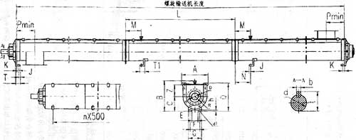 注:1、螺旋機(jī)輸送長(zhǎng)度及尺寸L均見(jiàn)表二、表三。 2、圖n×500為蓋板卡子尺寸,n值視螺旋機(jī)長(zhǎng)度而定。 3、圖中尺寸p為進(jìn)出料口中心線。