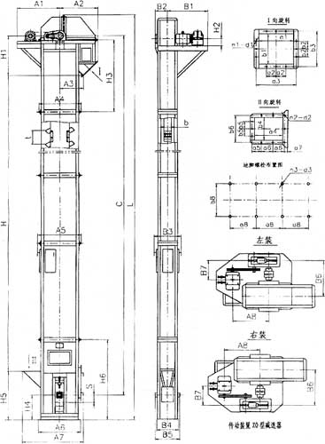 TH型斗提機外形見圖2,其尺寸見表7、驅動裝置配套及相關尺寸見表9。