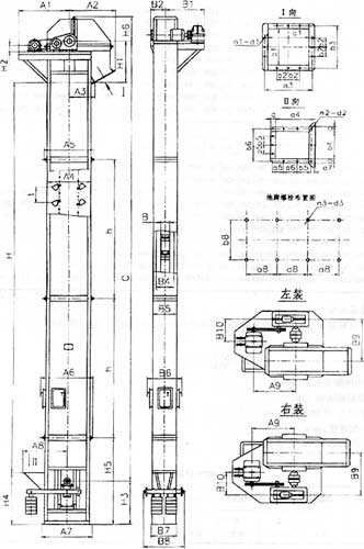 TD型斗提機外形見圖1,主要尺寸見表3,驅動裝置配套及尺寸見表4-表6,選用YZ型驅動裝置時,其安裝尺寸與制造廠聯(lián)系。